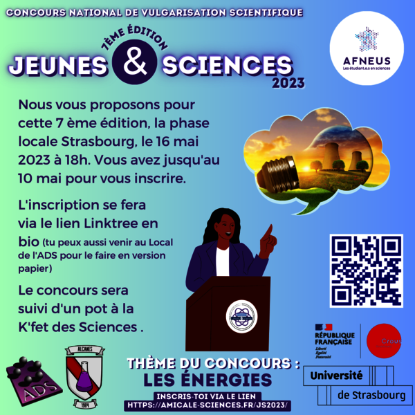 Depuis plusieurs années, l'AFNEUS (association fédérative nationale des étudiants universitaires en sciences) organise un concours de vulgarisation scientifique. La 7ème édition du concours Jeunes & Sciences vient d'être lancée ! La phase locale du concours Jeunes & Sciences est organisée…